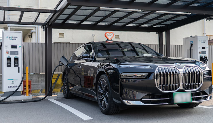 田中 我々は交通インフラを担う立場にある以上、脱炭素への対応を避けては通れません。難題ではありましたが、MKグループとして「必ずやり遂げなければならない取り組み」と位置づけました。最初の一歩として、2017年にEVを5台導入して試験運用を始めましたが、充電時間の長さや航続距離の不足といった課題が浮き彫りになりました。状況が大きく変わったのは2022年、ヒョンデの「IONIQ 5」を導入してからです。タクシーの走行距離は年間10万キロにも及ぶのですが、IONIQ 5はもともと故障が少なく安定した運用が可能なEVで、更にMKグループの整備工場がヒョンデの認定整備工場となり、自社で車両のメンテナンスを行える体制が整ったこともあり、2023年に大量導入を決断しました。同時期にe-Mobility Powerの「充電器導入・運用サービス」を利用し、複数の営業所に自社専用の急速充電器を設置したことにより、EVタクシーの運用体制が一気に整備されました。現在は252台のEVタクシーを保有し、日々多くのお客様に乗車いただいています。