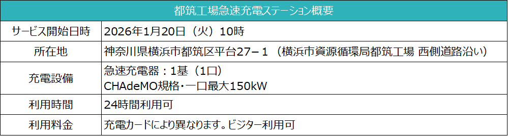 このたび、株式会社e-Mobility Power(代表取締役社長:池亀耕太郎、以下「当社」)は、横浜市都筑区の「横浜市資源循環局都筑工場(西側道路沿い)」の急速充電ステーションをリニューアルし、2026年1月20日(火)10時よりサービスを開始しましたので、お知らせいたします。