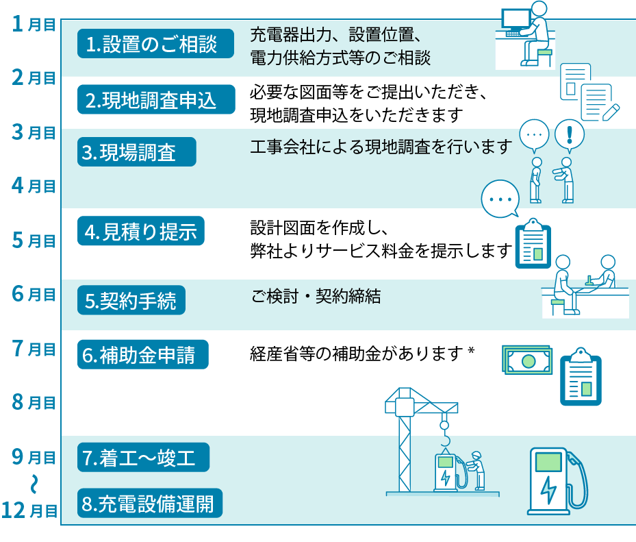 *充電器の運用開始に向け、電力会社・保守会社・コールセンター・認証プロバイダーとの契約が必要となります。